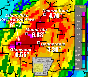 ![Twenty four hour rainfall totals through 7 AM CDT on June 11included 6.83 inches at Mount Ida (Montgomery County), 6.78 inches at Hopper (Montgomery County) and 6.55 inches at Glenwood (Pike County). [Map courtesy of the National Weather Service, Little Rock]](/img/130x97/exact/News/NWSmap4.gif)