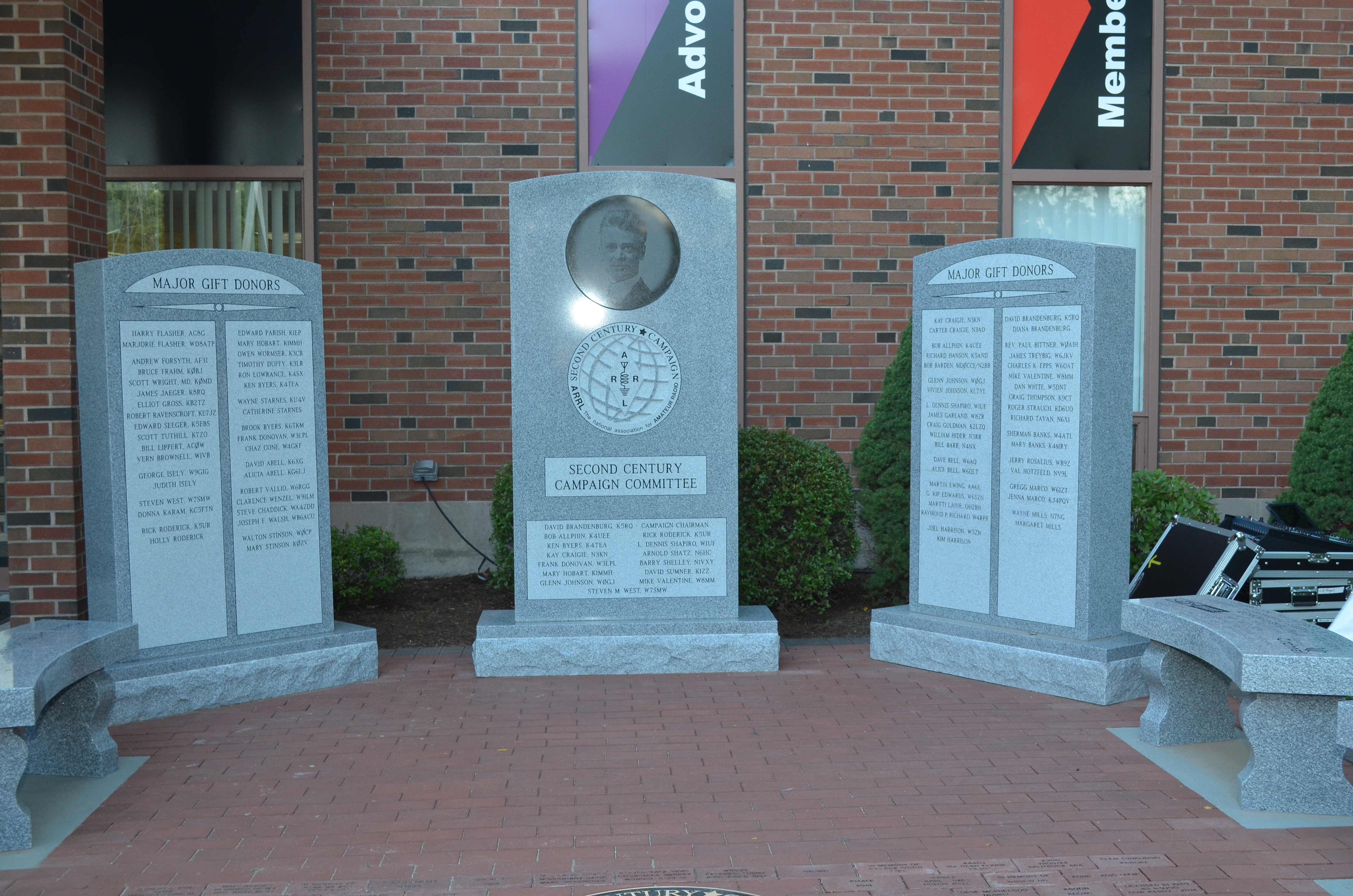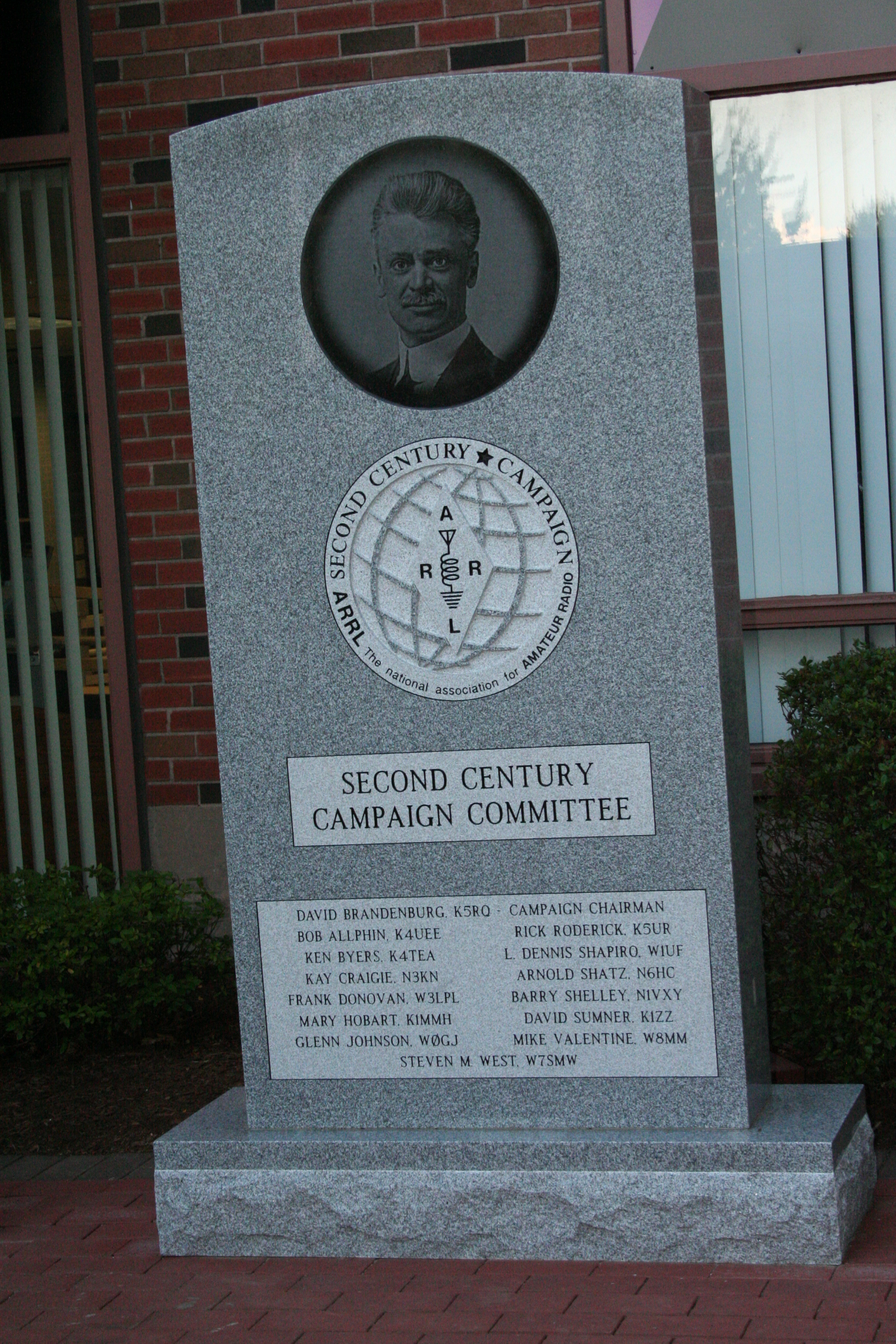 Visitors to ARRL Headquarters will be greeted with something new in the area in front of the main entrance. Complementing the terrace of memorial bricks and benches on the left, a new Centennial Terrace on the right side of the main entrance was dedicated on July 17 at a ribbon-cutting and reception, held in conjunction with the ARRL National Centennial Convention now underway in Hartford, Connecticut. The Centennial Terrace features an impressive central granite pillar bearing the visage of ARRL Co-Founder Hiram Percy Maxim, W1AW, and the names of the ARRL Second Century Campaign (SCC) Committee, chaired by David Brandenburg, K5RQ. The central pillar, which also displays the SCC logo, is flanked by two granite panels. Engraved on these are the names of those who went the extra mile in contributing major gifts to the ARRL Second Century Campaign.