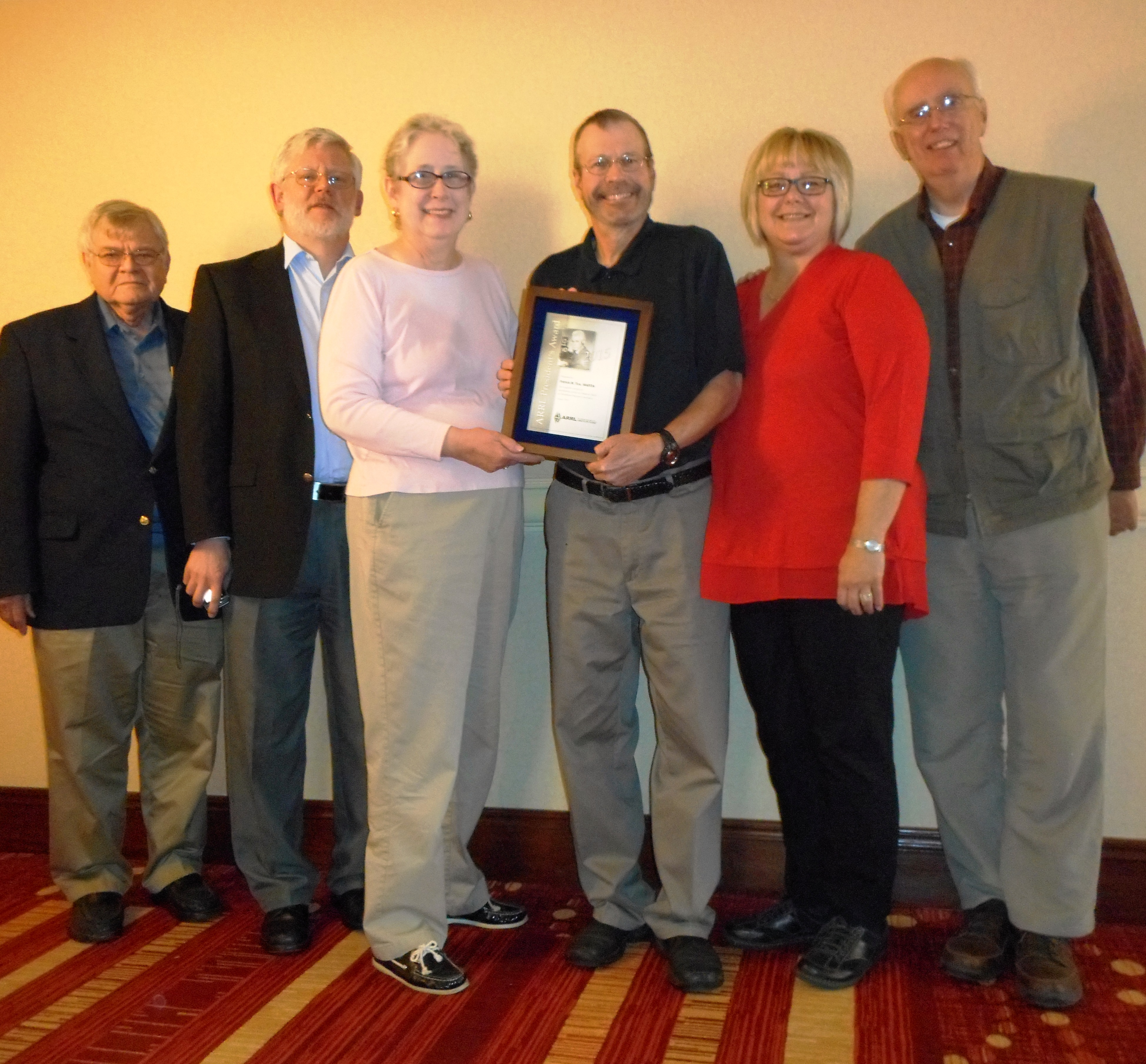 During its lunch break, President Kay Craigie, N3KN, presented the ARRL President’s Award to Patrick W. Tice, WA0TDA, who is retiring after a quarter century as Handiham program coordinator All attendees, along with Minnesota Section Manager Skip Jackson, KS0J, expressed their congratulations and appreciation to Pat and his wife, Susie. After the meeting resumed, President Craigie and Sumner brief the EC on ongoing discussions to ensure that Handiham Program services will continue after Tice retires.