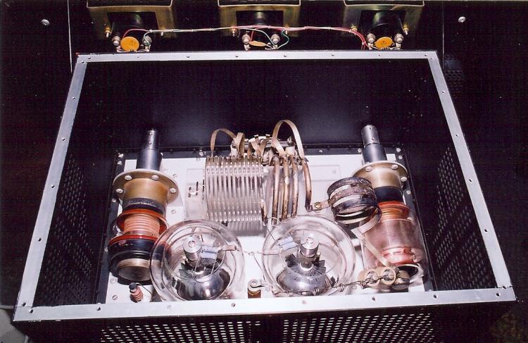 The three panel switches are illuminated rocker switches: green for filaments, amber for standby/operate and red for high voltage (HV). They are interlocked so that no power can be applied out of sequence. I installed a little indicator light at the top of the filament switch to show the timing of the filament voltage. It goes out when full filament voltage is applied and only then does the green filaments switch light come on.