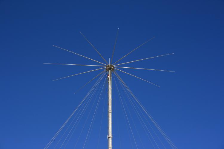 In the early 1960s, as part of the installation of the Base 571-7, the Collins Radio Company erected an absolutely beautiful discone antenna at the missile site. Discones are broadband antennas -- they are capable of radiating signals over a wide range of frequencies. The lowest usable frequency on a discone is established by the physical dimensions of the antenna. This particular antenna is something on the order of 80 feet tall, with an enormous crown, which means it will radiate effectively over a large portion of the HF spectrum.