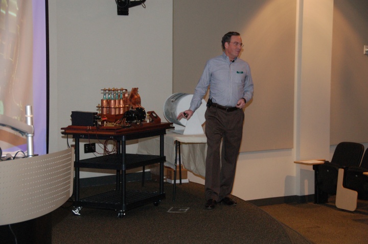 Hal Kennedy, N4GG, supplied the other historical bookend with a description and demonstration of his authentic recreation of a spark transmitter, known as “Blue Lightning.” Using modern-day jargon, Kennedy characterized the transmitter as a “Digital On-Off Keying, Spread-Spectrum” waveform. The transmitter is built completely of restored components, with the only exceptions being the use of modern-day glass bottles and aluminum foil for the Leyden jar charge-storage capacitor bank.