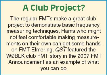The basic techniques for making carrier frequency measurements are the same as described back the October 2002 issue of QST. According to QST Contributing Editor H. Ward Silver, N0AX, you don't need a basement full of sophisticated lab equipment to make a surprisingly accurate measurement. "The frequency accuracy of most radios sold in the past decade is specified as ±10 ppm or better," he explained. "By calibrating your radio to a known frequency reference such as WWV or CHU and letting it reach an even, stable temperature, your measurements can be within 1 ppm or even better." The 2006 FMT announcement includes a sidebar on calibrating your receiver to an over-the-air frequency reference.