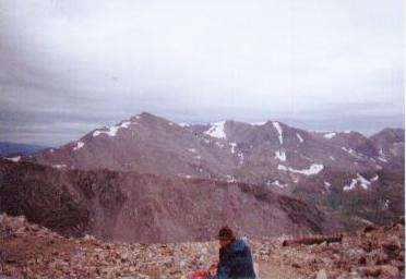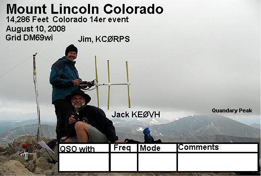 I was really hopeful we would have a band opening as the weather conditions were about the same as the day before when I had heard stations back east from my QTH. So sure enough, I heard a station sign from Chattanooga, Tennessee. So I started calling CQ from the top of Mount Lincoln at 14,286 feet. Then, after tuning around, I worked stations in eastern Tennessee (W2OO), Jackson, Mississippi (W4UDH) and AB4EJ, 50 miles southeast of Birmingham, Alabama. I also worked Dennis, N0SP, who was on Mount Thorodin close to Denver. He and I had talked the day before on 6 meters and he told me that he would look for us on Mount Lincoln. All this time, Jim was working a bunch of stations on 2 meters; a lot of the other peaks were on the air.