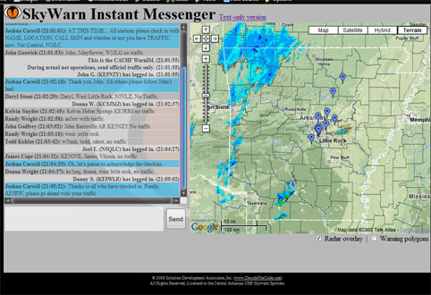 According to ARRL Arkansas Section Emergency Coordinator John Nordlund, AD5FU, members of the Central Arkansas UHF Group (CAUHF) provided real-time reports to the National Weather Service office in North Little Rock and to media outlets around the state. "The Group used the AR-Links SKYWARN net and the WarnIM system," Nordlund said. WarnIM is a SKYWARN instant messenger system serving to give those with or without ham radio access, or those who are in remote areas an additional means of communication in times of emergencies or severe weather events. Its features include live chat and access to updated radar data directly from the NWS.
