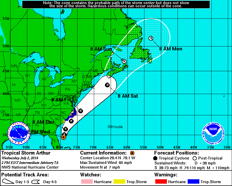 The Hurricane Watch Net (HWN) is preparing to activate for Tropical Storm Arthur, forecast to be upgraded to a Category 1 hurricane. Initial plans call for net operation to get underway on July 3 at 1600 UTC.