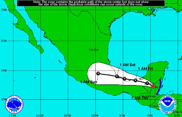 As of 1100 UTC, the Tropical Storm Earl was about 90 miles west of Belize City, with maximum sustained winds of 65 MPH. The Government of Mexico has discontinued all warnings. The Government of Belize has replaced the hurricane warning with a tropical storm warning for coastal areas.