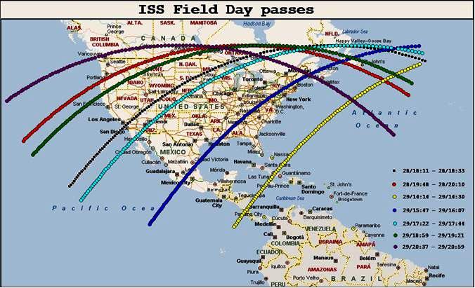 The ISS circles the Earth about once every 90 minutes. Some passes will favor some parts of the country while other passes will favor others. Wiseman has indicated that he will be willing to try these approximate pass times (see attached photo), but crew members may or may not be able to get on the air.