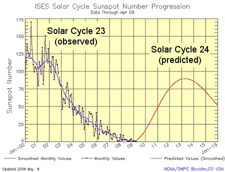 An international panel of experts -- led by the National Oceanic and Atmospheric Administration (NOAA) and sponsored by NASA -- has released a new prediction for the next solar cycle: Solar Cycle 24 will peak in May 2013 with a below-average number of sunspots. "If our prediction is correct, Solar Cycle 24 will have a peak sunspot number of 90, the lowest of any cycle since 1928 when Solar Cycle 16 peaked at 78," said panel chairman Doug Biesecker of NOAA's Space Weather Prediction Center (SWPC). This report clarifies a NOAA report from earlier this month that stated that Solar Cycle 24 would bring "90 sunspots per day on average."