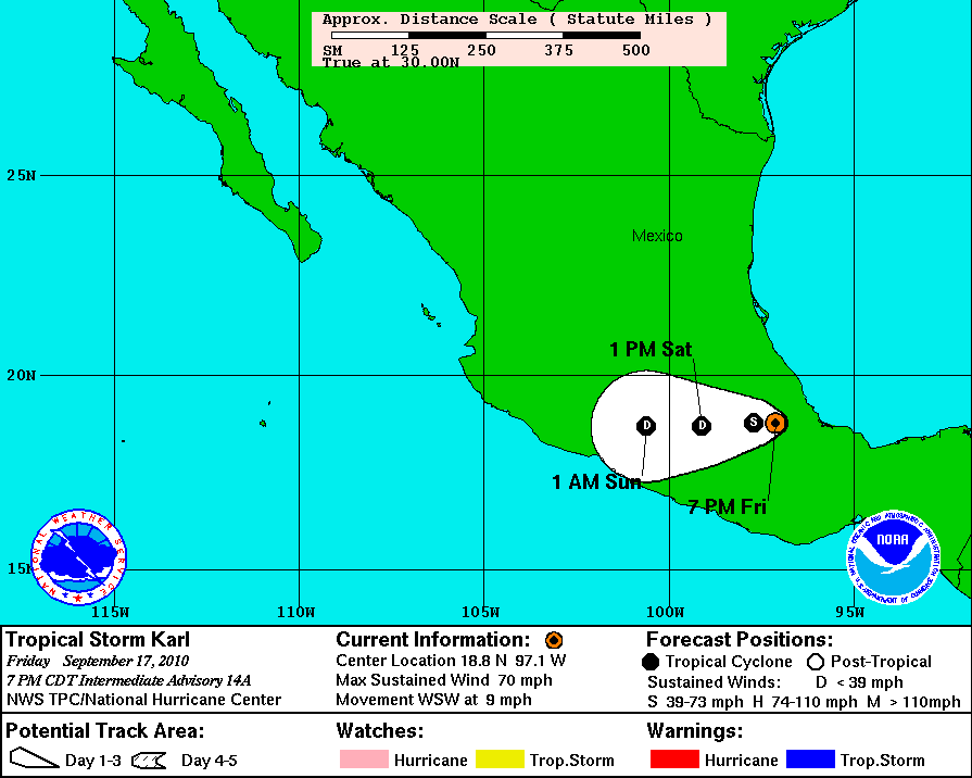 At 7:00 PM (CDT) on Friday, September 17, the center of Tropical Storm Karl is moving toward the interior of Central Mexico, currently heading in a west-northwest direction at 9 MPH. Forecasters at the National Hurricane Center are predicting that the storm with move further inland over South Central Mexico on Friday night and Saturday.