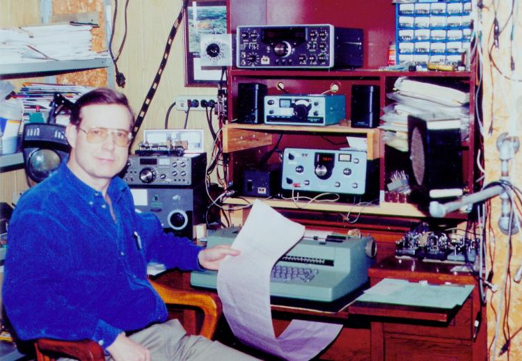 At my former QTH, VE3TMH, I fed my Selectric with a roll of teletype (TTY) paper that spooled over the back of the well in my desk and onto the floor. From time-to-time I enjoyed ripping off 5 or 6 feet of accumulated ragchew copy, balling it up and tossing it into the cylindrical file. A box of accordion-fold printer paper would make a fine substitute for TTY paper, which may be a bit hard to find today. In the photograph of my country station, VA3HN, you can see my manual Underwood ALL CAPS mill in the homebrew well that I cut into my $10 desk. I also have a manual Royal portable mill with United States Navy markings that I use portable (only 25 pounds!) as VE3HIE/QRP (low power operation).