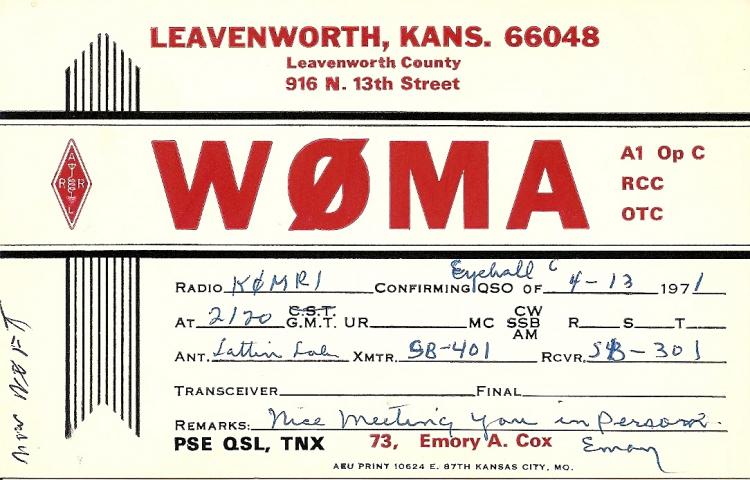 A couple of weeks later another letter arrived that started to nudge open the information door. It was from Bruce Frahm, K0BJ, in Colby, Kansas. He told me that he had been active on QKS, the Kansas NTS (National Traffic System) CW traffic net, in the late '60s and early '70s. He remembered my grandfather as "having a nice clean fist, with the exception of his 'trademark' call sign ID, almost always sent as 'W0Q', with no hint of a space between the 'M' and 'A'. A new station might be waiting for more, but we 'regulars' knew it was Emory!" This was exciting news, but Bruce had more for me! He included the calls of several other people who had been active in QKS at that time and who would probably remember my grandfather.