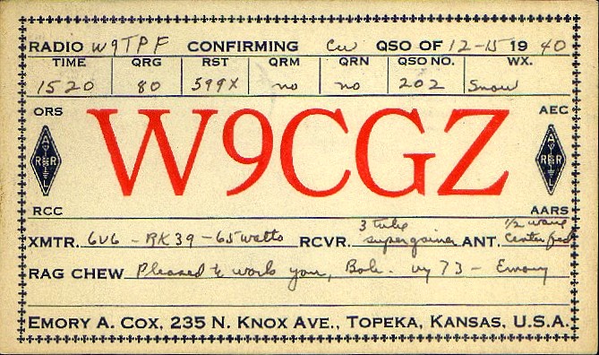 The QSL is for an 80 meter CW QSO on December 15, 1940 between my grandfather, W9CGZ, and Bob French, W9TPF. Both stations were located in Topeka, Kansas so it's not surprising that the signal report is 599X with no QRM (noise) or QRN (static). A blank used to report the weather says "snow." Another space indicates that this was QSO number 202. I don't know if that is the count for the current year or his count since first starting in ham radio in 1939. This wonderful card has produced a wealth of information about my grandfather's earliest radio activities.