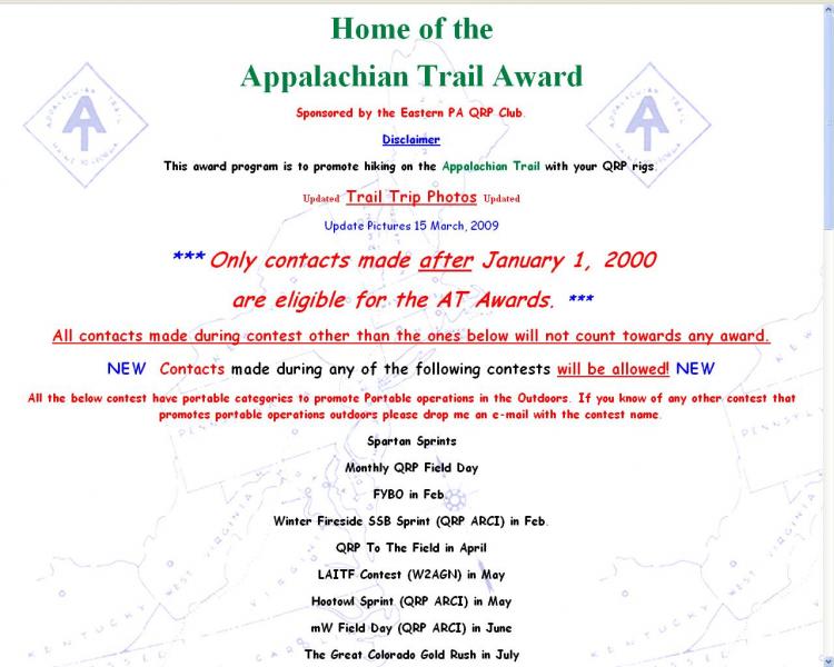Meanwhile, the Eastern PA QRP Club sponsors the Appalachian Trail Award to promote hiking on the Appalachian Trail with a QRP transceiver. Their Award Web page lists the rules for the award, as well as a bunch of useful links related to operating and hiking the Trail (be sure to read the "how to identify a dangerous snake" link if you plan on operating or hiking this or any other trail).