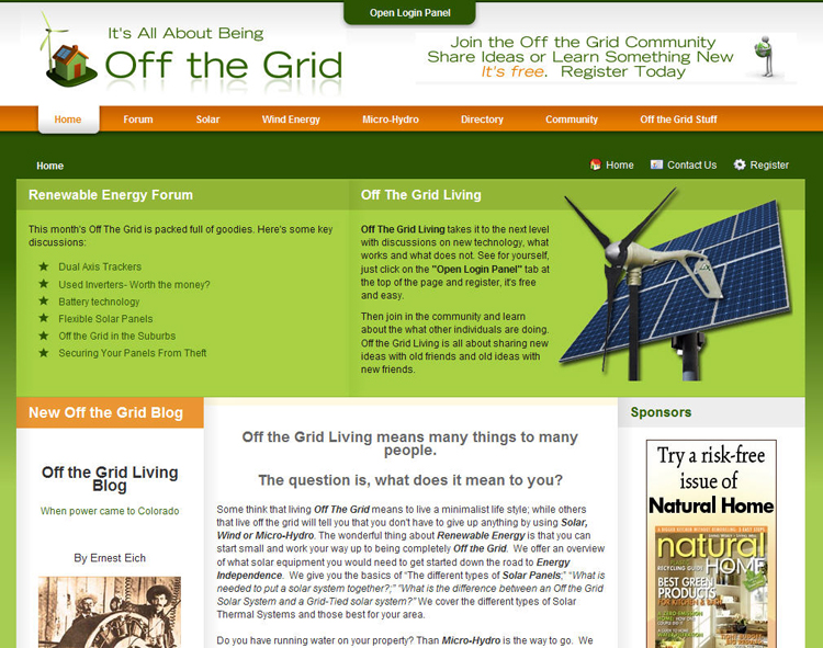 Off The Grid Living claims to take "it to the next level with discussions on new technology, what works and what does not," but it also has good articles about the basics, for example, Off the Grid 101.