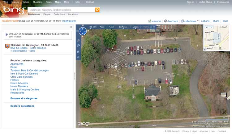 Meanwhile, over at Bing Maps, there is a new "3-D" feature called "Bing Maps 3D" that allows you to view buildings and landmarks in three dimensions in many "popular cities and areas." It is similar to the 3-D function of Google Earth with two big exceptions: (1) Bing Maps 3D only runs on Windows Vista and XP, and (2) "Bing Maps 3D" includes three-dimensional renditions of buildings in my little podunk of a hometown. Needless to say, I was very surprised to see familiar buildings around town in 3-D, whereas I am used to seeing those same buildings as flats using Google Earth.