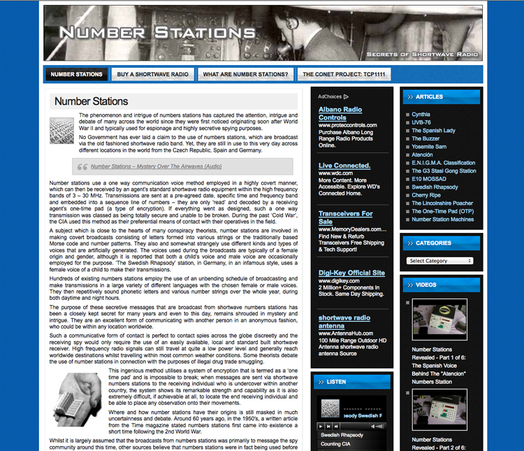 Remember numbers stations? Typically, a numbers station features an artificially generated female voice speaking strings of numbers, but shortwave listeners have also heard male and child announcers, and the contents of the messages are not always numbers.