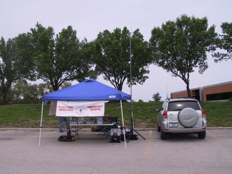 I'd met up with Steve, KC0QMU, at the staging area earlier that morning. Steve is our ARES® group's Emergency Coordinator and was the director of the exercise we were going to run that day. He had already set up his canopies, radios and the ARES promotional material at staging. His new ARES banners were fluttering in the morning breeze.