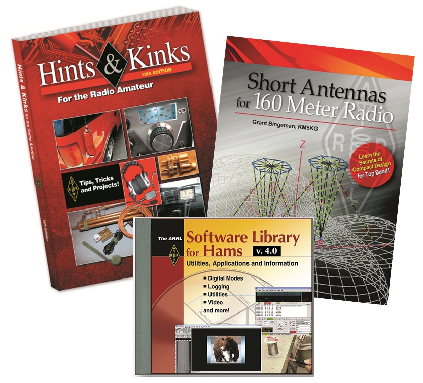 These two books and CD_ROM are available from your ARRL Dealer or the ARRL Store; the software library is also available for immediate download from the ARRL online store. Hints & Kinks for the Radio Amateur (18th Edition) (ARRL Order No 5200), ISBN 978-0-87259-520-0, $22.95 retail, special ARRL Member Price $19.95 (limited time only), plus shipping; Short Antennas for 160 Meter Radio (ARRL Order No 5798), ISBN 978-0-87259-579-8, $22.95 retail, special ARRL Member Price $19.95 (limited time only), plus shipping. Software Library for Hams CD-ROM version 4.0: physical version -- (ARRL Order No 4364), ISBN 978-0-87259-436-4, $22.95 retail, special ARRL Member Price $19.95 (limited time only), plus shipping; downloadable version -- ARRL Order No 4364D, $19.95 retail. Telephone 860-594-0355 or toll-free in the US 888-277-5289; www.arrl.org/shop; pubsales@arrl.org.